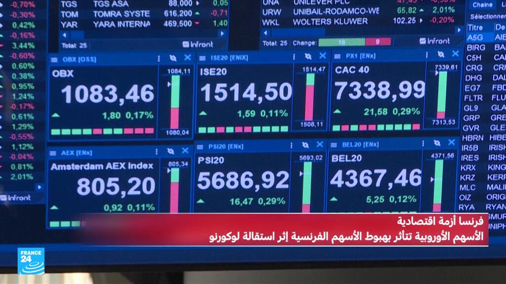 عقب الإعلان عن استقالة رئيس الحكومة الفرنسي سيباستيان لوكورنو تراجع مؤشر كاك 40 للأسهم الفرنسية بنسبة 2 في المئة، كما هبطت الأسهم الأوروبية بضغط من تراجع الأسهم الفرنسية حيث انخفض المؤشر ستوكس 600 الأوروبي بنسبة 0.4 بالمئة. الاستقالة المفاجئة أدت أيضا إلى ارتفاع أسعار الفائدة على الاقتراض في فرنسا. وارتفع سعر السندات لأجل 10 سنوات بمقدار 7 نقاط أساس وهو المستوى الأعلى منذ أواخر عام 2024. يذكر أن البلاد تمر في وضع اقتصادي صعب حيث تجاوز العجز 5% من الناتج المحلي الإجمالي.