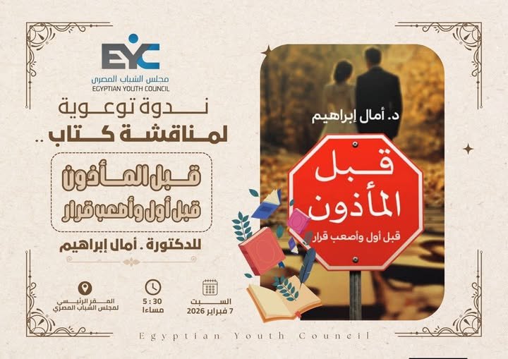 يُعلن البرنامج الوطني لتعزيز الحق في التعليم تحت مظلة مجلس الشباب المصري عن إقامة ندوة توعوية لمناقشة كتاب: «قبل المأذون قبل أول وأصعب قرار » للكاتبة المتميزة /الدكتورة أمال إبراهيم استشاري العلاقات الأسرية