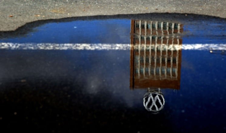ينعكس مقر شركة فولكس فاغن في بركة مياه في فولفسبورغ: 28 فبراير 2020. ا ف ب