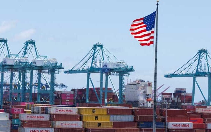 العلم الأمريكي يرفرف فوق سفينة وحاويات شحن في ميناء لوس أنجلوس واشنطن: علّق الرئيس الأمريكي دونالد ترامب...